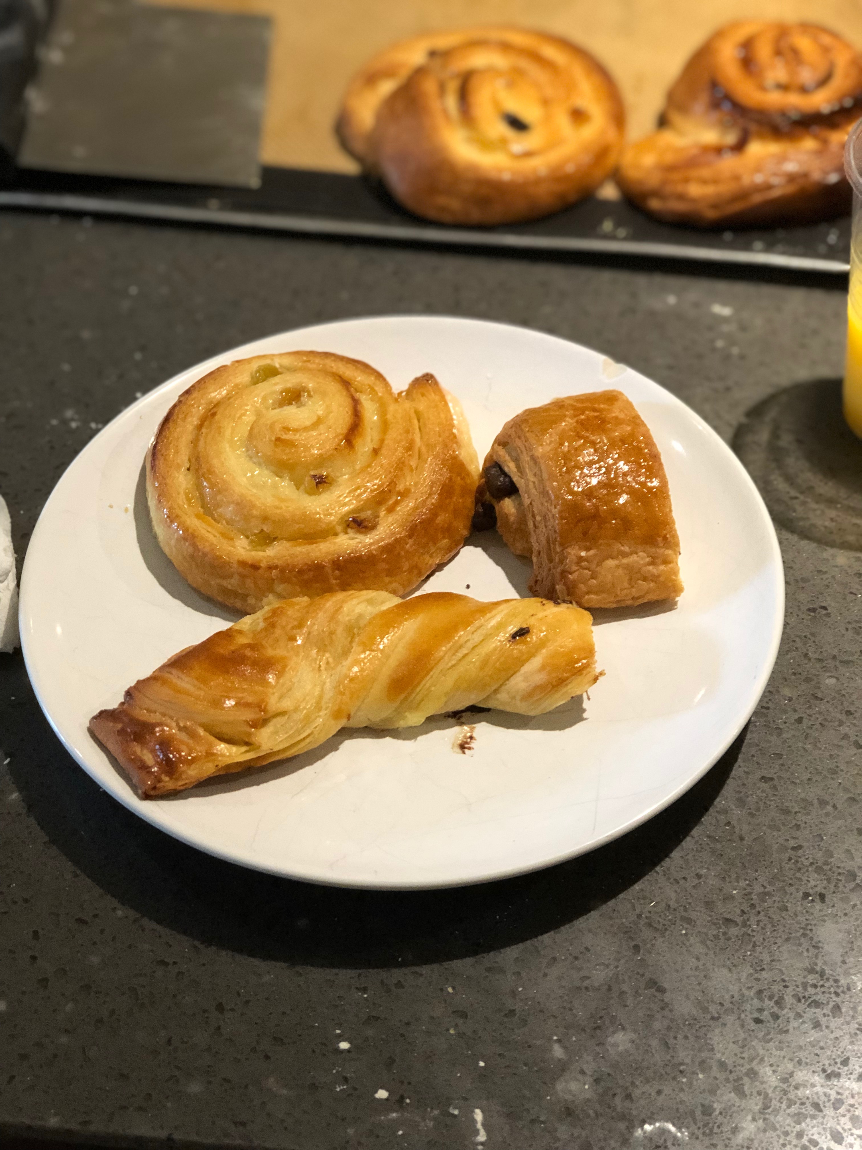 Another chef taught cooking class we attended was in France. We made many variants of croissants. The dough for all of the variants was the same. When making the dough we had to knead the consistently to activate its elasticity. It has to be refrigerated and allowed to sit for hours. Then we take butter and shape it into a rectangle and allow it to cool in the fridge. We then shaped the dough into a similar shape but thicker version of the butter, and then the dough and butter are folded together and allow it to rest to prevent the butter from melting. We then shaped the croissants into their final shape and allowed them to prove for 2-3 hours at room temperature before baking them. The process to make a croissant is very methodical and requires patience, timing and focus. This is something that once the dough is made the final product depending on shape, fillings, toppings can be one of multiple formats. The effort in making the croissants leads to an even better reward when they are done and can be enjoyed. Whether you make them for yourself or buy them from a French bakery, they are complex in taste and texture but simple in ingredients. Even watching people eat croissants is a process, pulling apart the flaky layers and enjoying the experience of eating the croissant. It is definitely a slow food experience and supporting the slow food movement making or even just purchasing and eating a freshly made croissant. I was unable to capture the recipe for the croissants we made but have the ingredients and understand the process. there are also many traditional croissant recipes available on line for reference. I look forward to sharing the experience of making croissants with my family and retelling the story of our time with the chef in France.