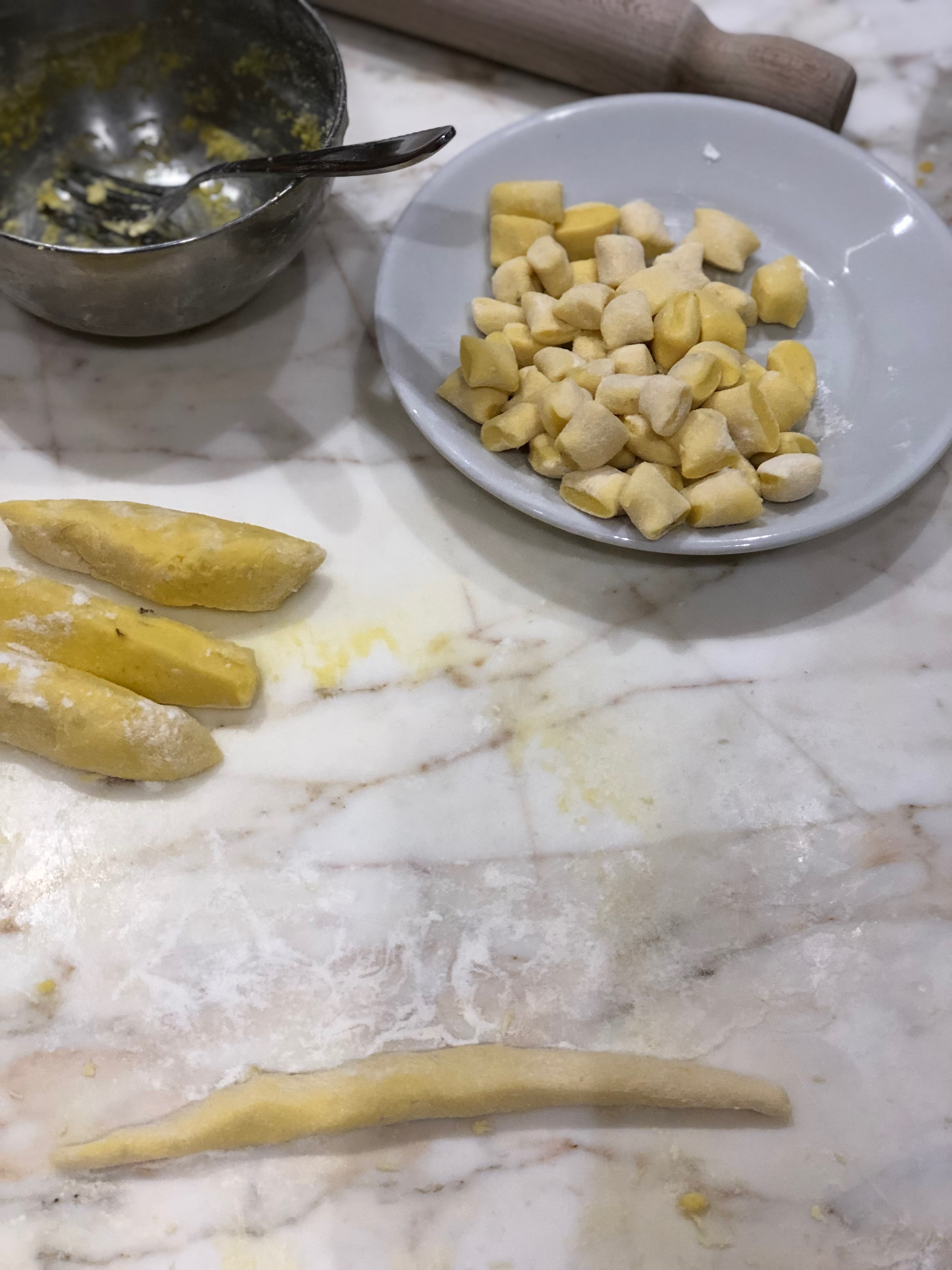 flour to prep table, then mixed together 300 grams potato,1 egg yolk, pinch of salt, 1200 grams of flour. the ingredients are mixed together then worked on a wooden table or cutting board. Roll out the dough then cut into small pieces about the size of a small square. You can press with a fork to make indentations in the dough dumping. The indentations once cooked helped the Gnocchi hold sauce. The dough is boiled in water until cooked. Gnocchi are served with butter and sage, or can be served with a traditional marinara sauce or a variety of other sauces, so there are many variations you can experience in restaurants. You can also add to the dough and include ricotta, spinach and other fillings. So while a very traditional dish there are many variations possible that allow for unique interpretations of the traditional recipe. While typically pasta is not my favorite go to entree, Gnocchi is different and my go to order when we are dining Italian. It’s very simple nature, dense and filling pasta, and variations of sauces appeal to me. Now with my 1st hand experience with preparing Gnocchi I will make it at home as well. It provides a recipe that can be made with common household ingredients, that can involve the family and encourage a meal of slow eating and a full dining experience from preparation to eating. Having this at home and then eating with my family is a great way to celebrate the slow food movement.
